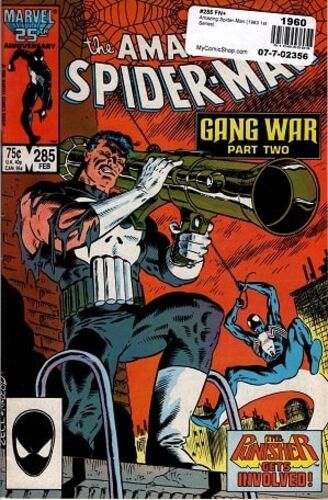 1986年のギャング抗争、Amazing SPIDER-MAN (“ASM”) 285号、286号をレビュー。 筋書きをTom DefalcoとJim Owsley、画をAlan Kupperberg、インクをJim FernとArt Nicholasがそれぞれ担当。添付画像はASM 285号の表紙。Mike Zeckによるもの。Zeckと言えばPUNSH…
