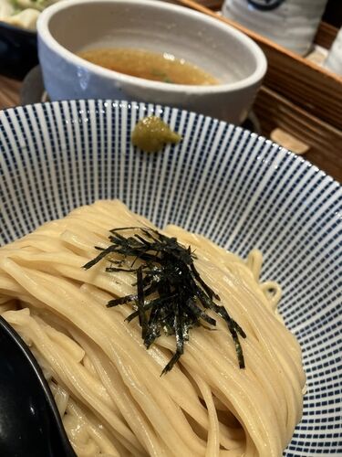 この週はちょっと遠出が出来ないため、赤坂で冷たい麺を食べられるこの店を訪問した。「淡麗塩つけ麺」920 yen、「水餃子」310 yenを注文した。具は、メンマ、青葱、刻みノリ、チャーシュー×3枚。チャーシューは、バラ肉。歯を入れるとスルッと噛み切れる柔…