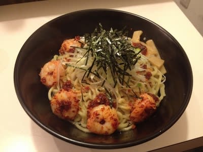 この日は、またまた寒さが振り返した。正午時点で気温は10度に届かなかったな。先週は温かいラーメンだったので、この日は、「まぜそば」専門店に挑戦。ちょっと海老の写真に惹かれて、「えびラー油そば 」800 yenを注文した。