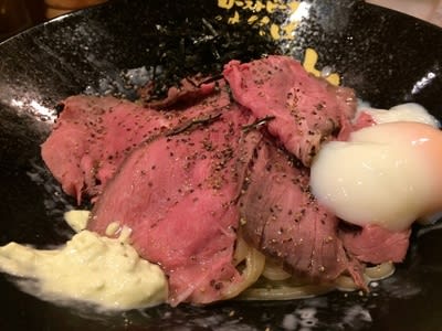 具は、玉葱、刻みノリ、半熟卵、ローストビーフ。トッピングとして「玉葱」をたのまなければ、超シンプルだな。ローストビーフは80 g。柔らかくて美味しい。価格設定も高めなので、品質が良くて当然だが、満足な内容。