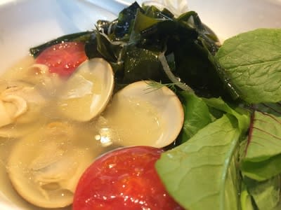 この日は、朝からこの店のラーメン食べるべく気持ちの準備を整え、早めに会社を出て麹町へ。野菜中心の基本のラーメンも捨てがたかったのだが、貝のスープは大好きなので、「ハマグリとハーブの三陸わかめ潮ラーメン」 1,000 yenを注文した。
