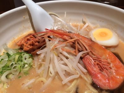 実はこの日、性懲りもなく冷やしラーメンを食べに行った。そうしたらもうそのメニューなくなってた。1週遅かったかな。そこで、店頭のャXターでひと際目立っていた「海老味噌麺」880 yenを代わりに注文した。このメニュー2年前も注文していたようだが、グレードアップしていた。