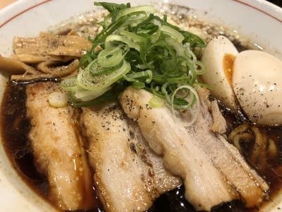 新宿御苑近くの看板の写真を撮って見せると味玉無料というキャンペーンに乗って訪問したのは、「京紫灯花繚乱」。随分前からこの店を再訪しようと思っていたが、漸く実現。通常の醤油ラーメンとどちらか迷ったが、「ブラック中華そば」850 yenを注文した。
