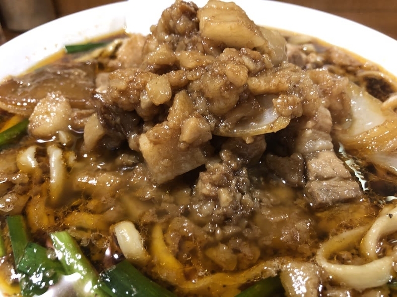 麺は、断面が横に長い長方形。きしめんのような麺。質感はもっと硬いかな。量はかなりある印象。食べきれないかと思った。
